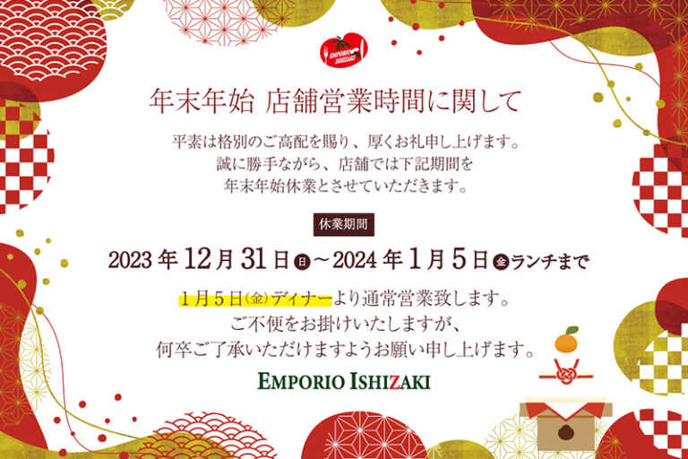 今年の5月に店舗がオープンしてから初めてのクリスマスを迎えます。 本格イタリアンのコースが堪能できるEMPORIO ISHIZAKIから当店でしか味わう事の出来ないクリスマススペシャルメニューをご用意いたしました。 お昼…